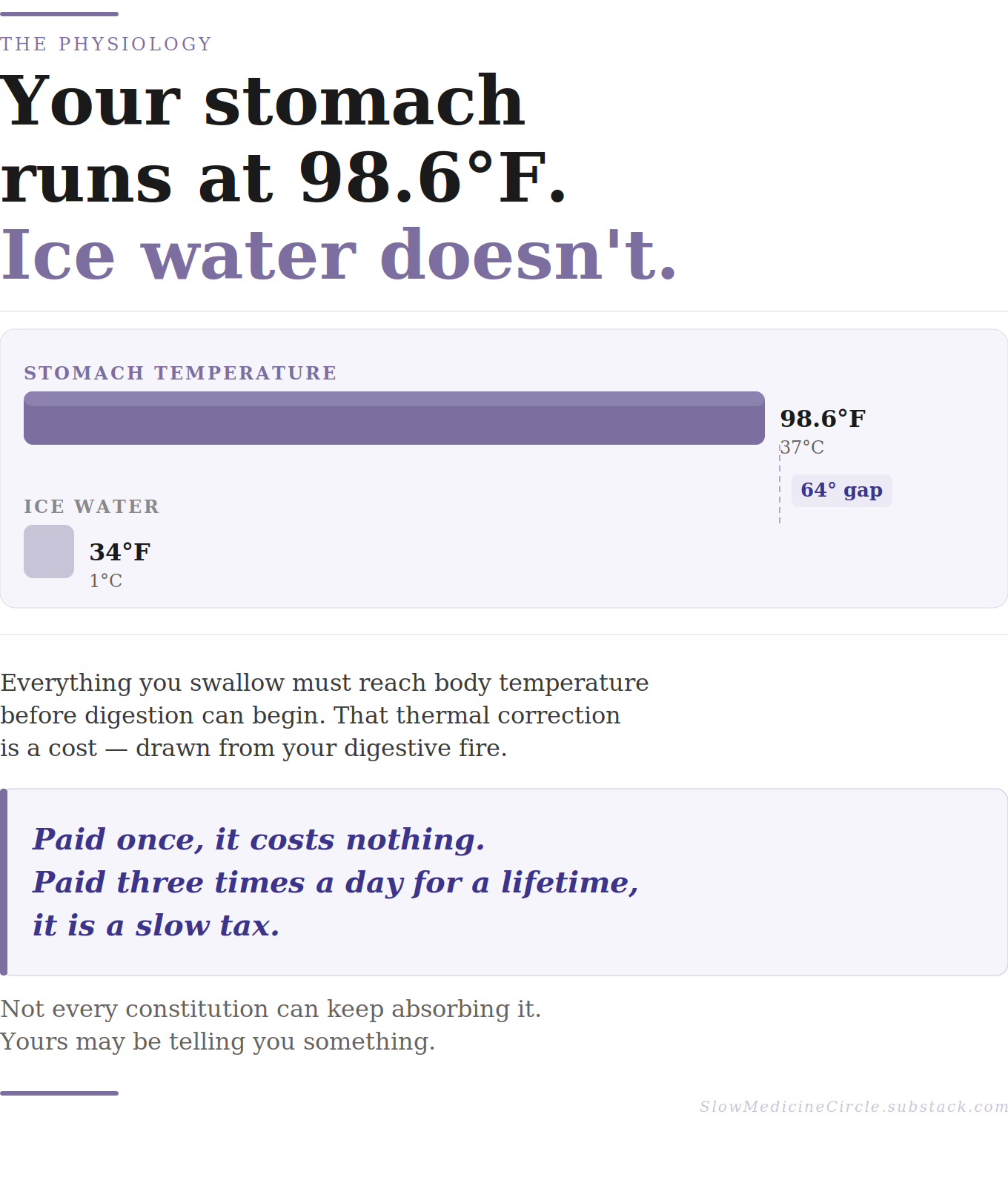 The stomach runs at approximately 98.6°(37°C). Everything you put into it has to be brought to that temperature before the real work of digestion can begin. Ice water at 34° F (1°C) is more than 60° F (33°C) colder than the environment it is entering. That thermal gap costs something. Paid once, it is nothing. Paid three times a day for a lifetime, it is a slow tax on the digestive fire that many constitutions simply cannot keep absorbing.