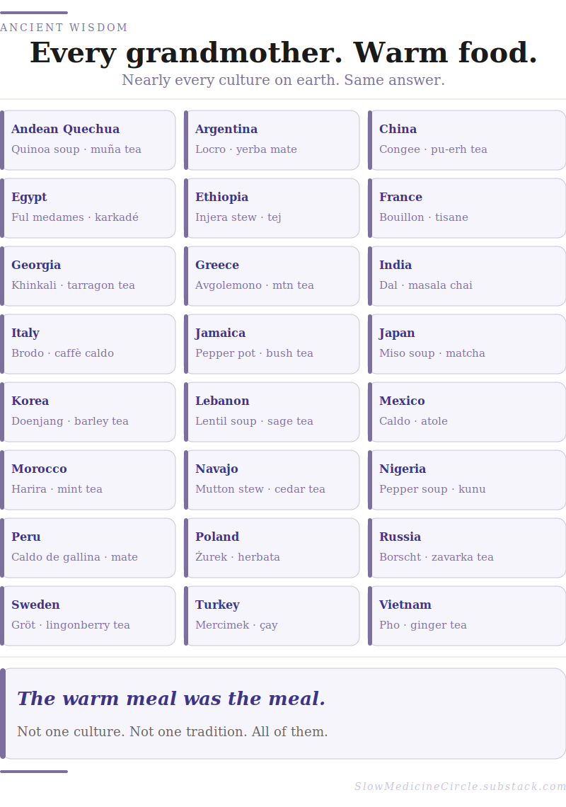 Broth, slow cooked grains, warm and easily transformed food: every medical tradition on earth arrived at some version of this independently. Not coincidence. Observation accumulated over centuries, written into the muscle memory of every culture that managed to survive long enough to pass it down.